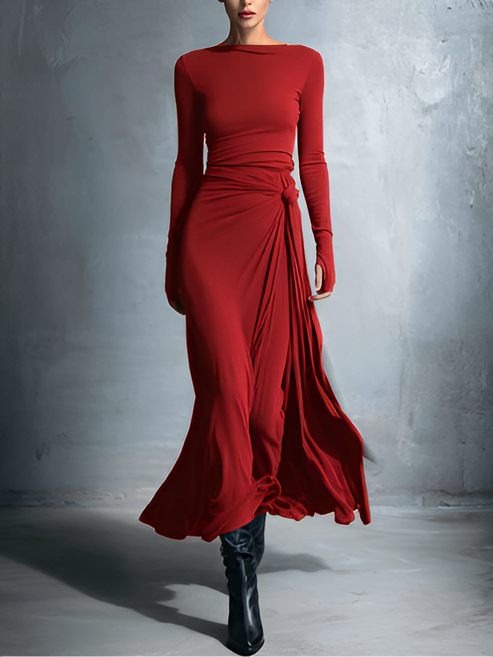 The Ludovica dress is an ode to minimalist sophistication. Its fluid, stretch fabric gently contours the body, creating a sleek and elegant silhouette. The wrap-around design, featuring a signature side knot, adds movement and character, making it the perfect statement piece for any special occasion.